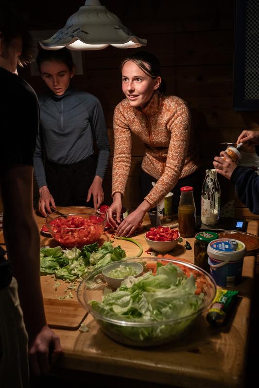 Besonderer Wert wird auf eine ausgewogene Ernährung mit frischen, saisonalen und möglichst regionalen Lebensmitteln gelegt. Lebensmittelallergien und Unverträglichkeiten werden selbstverständlich berücksichtigt. Für viele Teilnehmende ist es eine neue Erfahrung, Mahlzeiten für eine große Gruppe zu planen, einzukaufen und vorzubereiten. Diese Aufgaben übernehmen die Jugendlichen im Rahmen von Küchen- und Einkaufsdiensten, stets begleitet und unterstützt durch das pädagogische Fachpersonal.