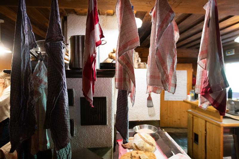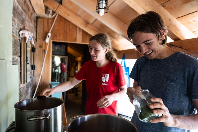 Gekocht wird sowohl drinnen als auch draußen. In der Almhütte steht eine voll ausgestattete Küche mit Kühlschrank, Elektroherd und Spülmaschine zur Verfügung. Zusätzlich gibt es im Außenbereich eine weitere Kochstelle, die sich besonders für große Mengen eignet. An ausgewählten Tagen wird gemeinsam vor der Hütte gegrillt. Schnell wird dabei klar: Die Küche ist nicht nur ein Arbeitsplatz, sondern auch ein zentraler Treffpunkt – oft entstehen hier die besten Gespräche und die lebendigsten Momente des Zusammenlebens.