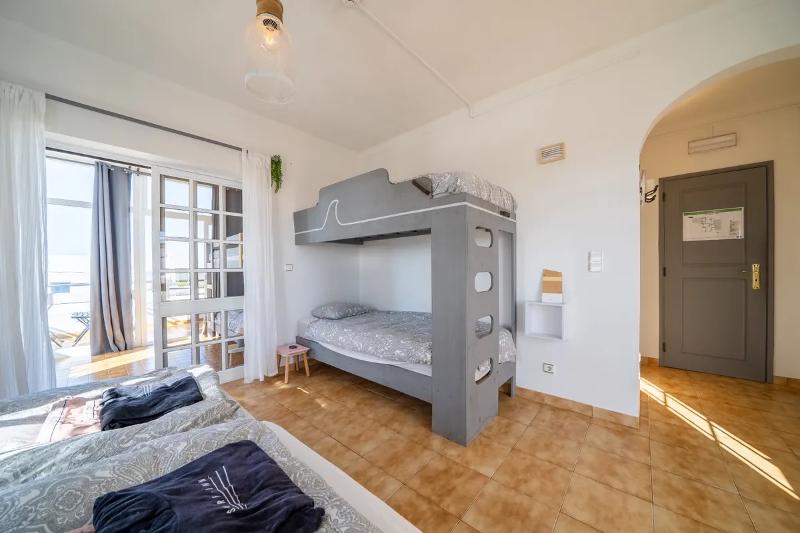 Geräumige 4- bis 6-Bett-Zimmer mit Meerblick und/oder Balkon. Dieser Zimmertyp ist der schönste bei Surfinn Algarve. Die Zimmer verfügen über Meerblick, eine eigene Terrasse und ein eigenes Bad. Ihr findet dort ein bequemes Doppelbett und Etagenbetten. Außerdem sind die Zimmer mit großen, stilvollen Einbauschränken ausgestattet und bieten ausreichend Platz, um all eure Sachen bequem zu verstauen.