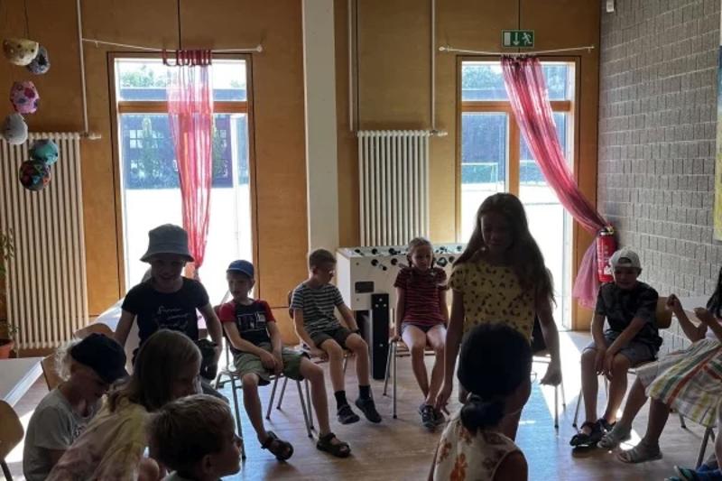 Auch drinnen gibt es viel Platz: Ein großer Raum mit Bühne lädt zu kreativen Aktionen ein, während ein weiterer Raum für Gruppenarbeiten genutzt wird. In den Pausen sorgen Tischtennis und Billard für zusätzliche Unterhaltung.