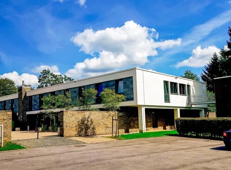 Die moderne Jugendherberge ist umgeben von Wiesen und liegt auf einem Höhenzug der Eifel.