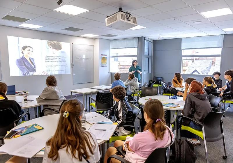 Der inkludierte Intensiv-Sprachkurs umfasst 20 Lektionen à 45 Min pro Woche. Hier werden speziell die Bereiche Hör- & Leseverständnis, Kommunikation und Grammatik vermittelt. Auch Projektarbeit und Präsentationen gehören zu eurem Sprachkurs.