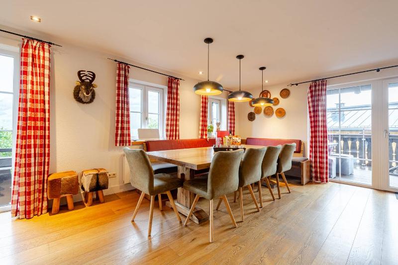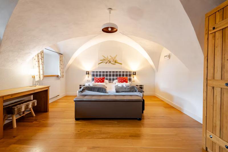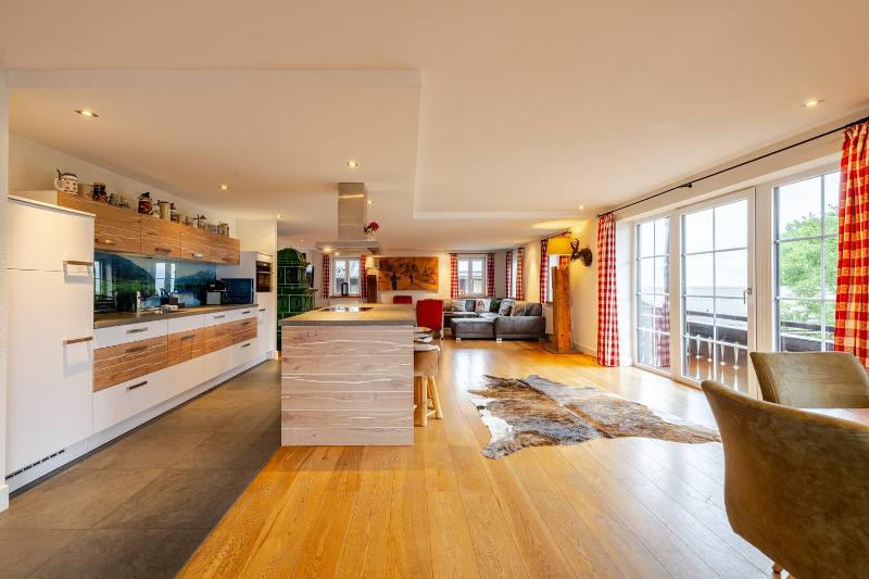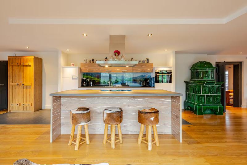 Eure Unterkunft ist eine luxuriöse Wohnung mit 300qm die Platz für bis zu 14 Personen bietet, in welcher ihr euch voll und ganz zurücklehnen könnt. Die Unterkunft ist Teil eines alten Bauernhauses aus dem Jahre 1613 und ist nicht nur sehr luxuriös sondern bietet euch auch einen gewissen Charme. Die offene Küche, drei Bäder, der traditionelle Kachelofen und die private finnische Sauna bieten euch Raum für gemeinsame offene Atmosphäre und genügend Entspannung. Außerdem bietet euch die Unterkunft gleich 4 Balkone, auf welchen ihr schön die Sonne und die Aussicht genießen könnt.