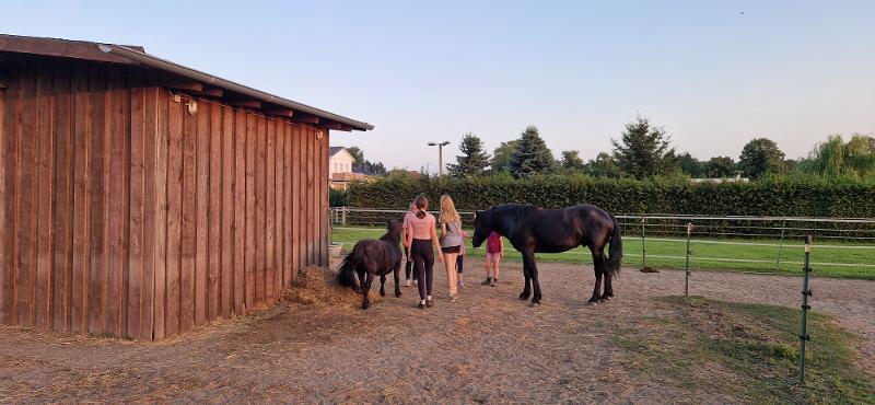 Bei uns erlebt ihr die Pferde nicht als „Reitstunde im Kreis“, sondern so, wie das Pferdeleben wirklich ist. Im Pferdeparadies Fehrbellin von Tanja und Monique taucht ihr in eine Woche in die Pferdewelt ein, in welcher es nicht nur um das Reiten geht, sondern das Leben mit Pferden kennenzulernen. Ihr lernt, was es bedeutet, Pferde zu haben, sie zu sehen, zu lesen und Vertrauen aufzubauen. Dazu gehört auch viel Arbeit, denn Pferd heißt zu einem sehr großen Teil Verantwortung: putzen, vorbereiten, den Putzplatz sauber halten, Wasser auffüllen, Pferde von der Weide holen und anpacken, wenn etwas gemacht werden muss. Natürlich wird bei uns auch geritten, doch Reiten ist nur ein kleiner Teil von dem, was ein echtes Leben mit Pferden ausmacht. Genauso geht ihr mit den Pferden spazieren, macht Bodenarbeit, lernt Führen und Longieren, pflegt Hufe und bereitet gemeinsam Futter vor. Einige Pferde brauchen besondere Pflege oder spezielles Futter, auch das gehört ehrlich dazu.